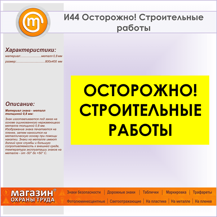 Знак «Осторожно! Строительные работы», И44 (металл, 800х400 мм) в Ульяновске купить