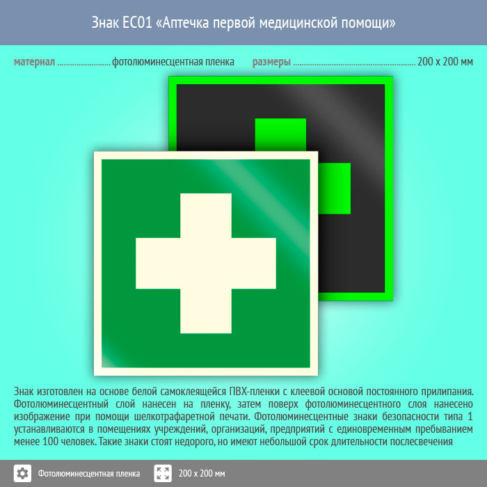 Знак EC01 «Аптечка первой медицинской помощи» (фотолюминесцентная пленка, 200х200 мм) в Ульяновске купить