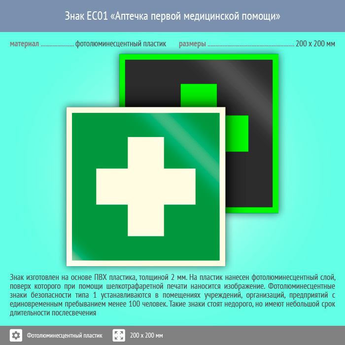 Знак EC01 «Аптечка первой медицинской помощи» (фотолюминесцентный пластик, 200х200 мм) в Ульяновске купить