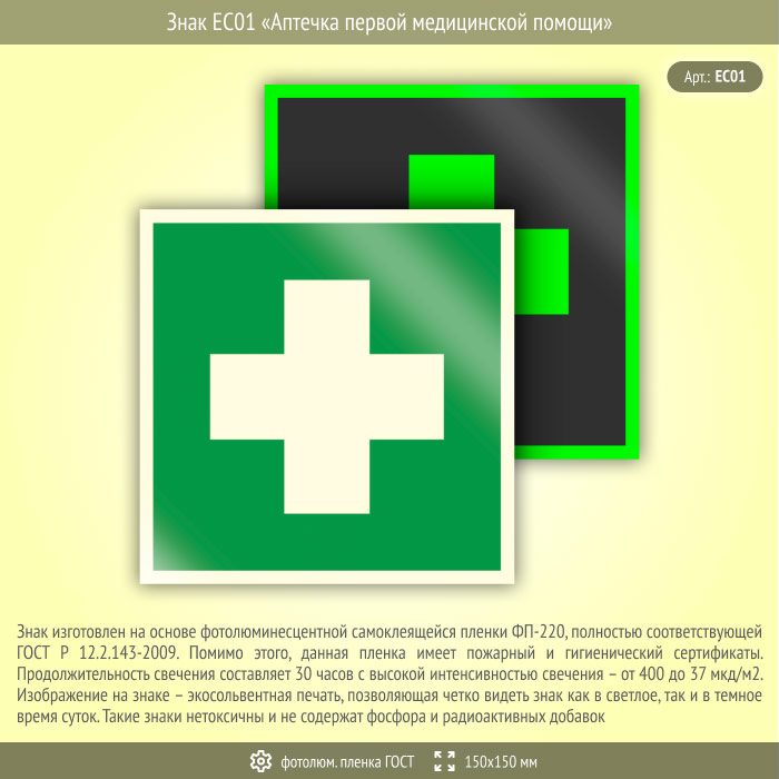 Знак EC01 «Аптечка первой медицинской помощи» (фотолюминесцентная пленка ГОСТ 34428-2018, 150х150 мм) в Ульяновске купить