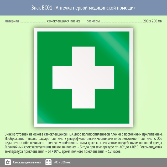 Знак EC01 «Аптечка первой медицинской помощи» (пленка, 200х200 мм) в Ульяновске купить