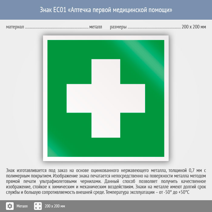 Знак EC01 «Аптечка первой медицинской помощи» (металл, 200х200 мм) в Ульяновске купить