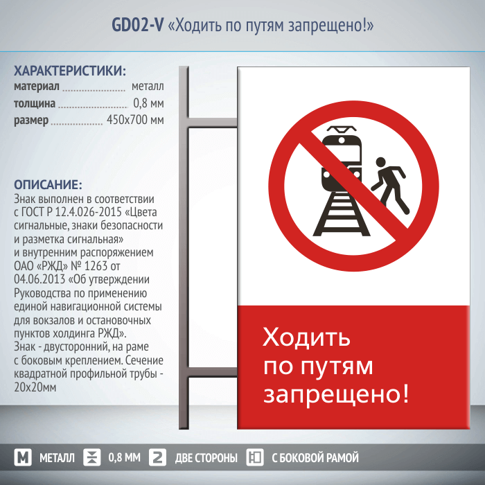 Знак «Ходить по путям запрещено!», GD02-V (двусторонний вертикальный, 450х700 мм, металл, на раме с боковым креплением) в Ульяновске купить