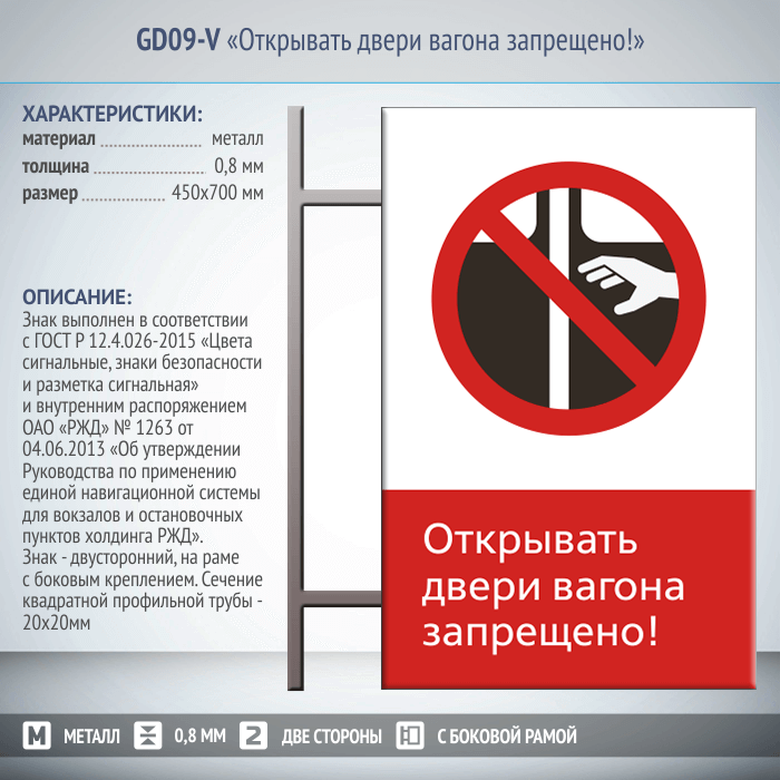 Знак «Открывать двери вагона запрещено!», GD09-V (двусторонний вертикальный, 450х700 мм, металл, на раме с боковым креплением) в Ульяновске купить