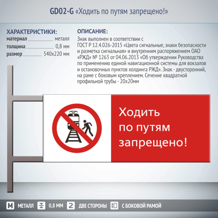 Знак «Ходить по путям запрещено!», GD02-G (двусторонний горизонтальный, 540х220 мм, металл, на раме с боковым креплением) в Ульяновске купить