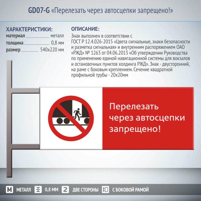 Знак «Перелезать через автосцепки запрещено!», GD07-G (двусторонний горизонтальный, 540х220 мм, металл, на раме с боковым креплением) в Ульяновске купить