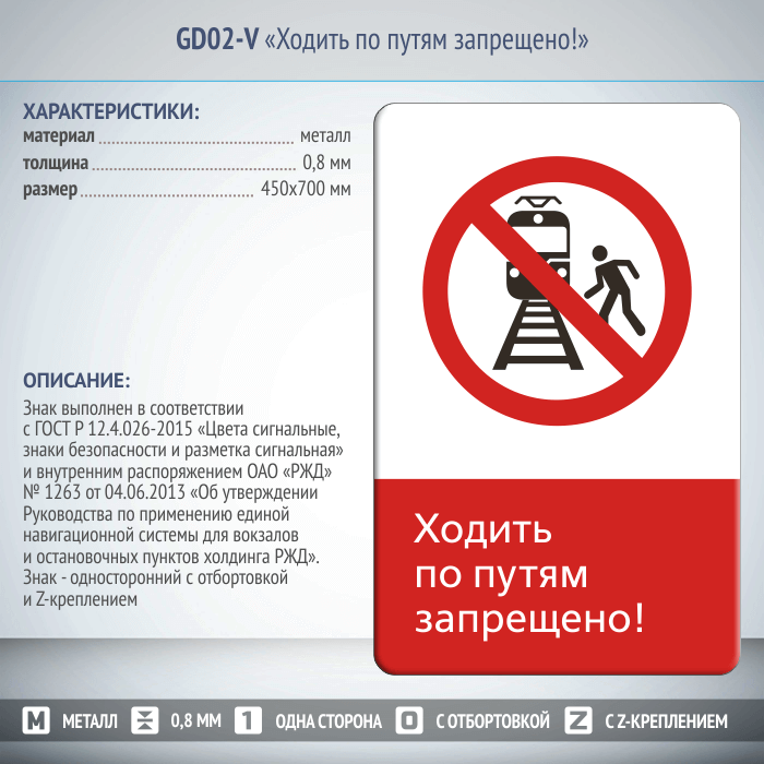 Знак «Ходить по путям запрещено!», GD02-V (односторонний вертикальный, 450х700 мм, металл, с отбортовкой и Z-креплением) в Ульяновске купить
