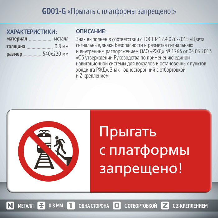 Знак «Прыгать с платформы запрещено!», GD01-G (односторонний горизонтальный, 540х220 мм, металл, с отбортовкой и Z-креплением) в Ульяновске купить