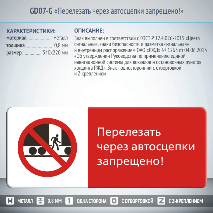 Знак «Перелезать через автосцепки запрещено!», GD07-G (односторонний горизонтальный, 540х220 мм, металл, с отбортовкой и Z-креплением) в Ульяновске купить