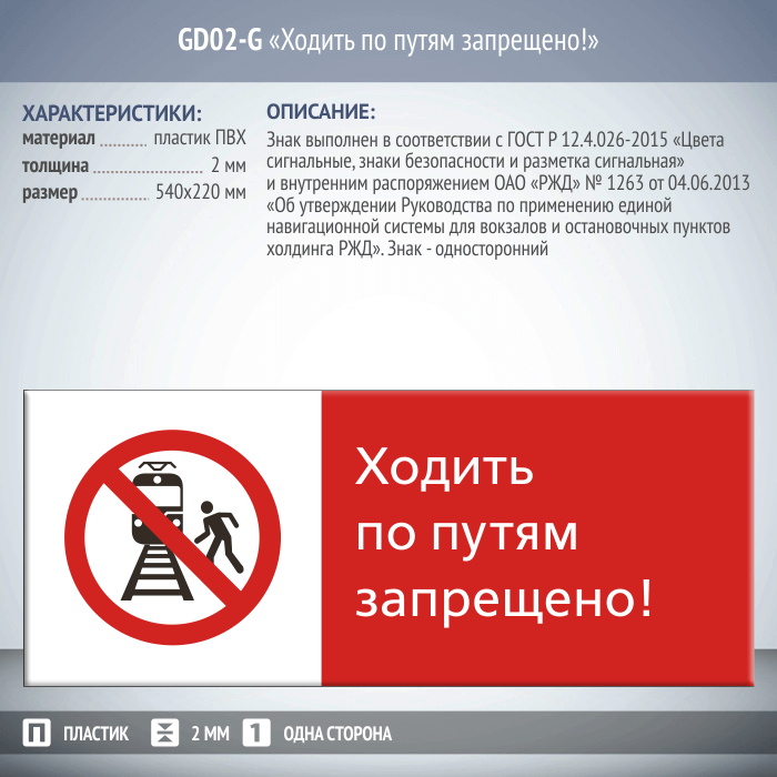 Знак «Ходить по путям запрещено!», GD02-G (односторонний горизонтальный, 540х220 мм, пластик 2 мм) в Ульяновске купить
