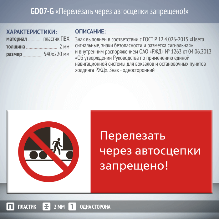 Знак «Перелезать через автосцепки запрещено!», GD07-G (односторонний горизонтальный, 540х220 мм, пластик 2 мм) в Ульяновске купить