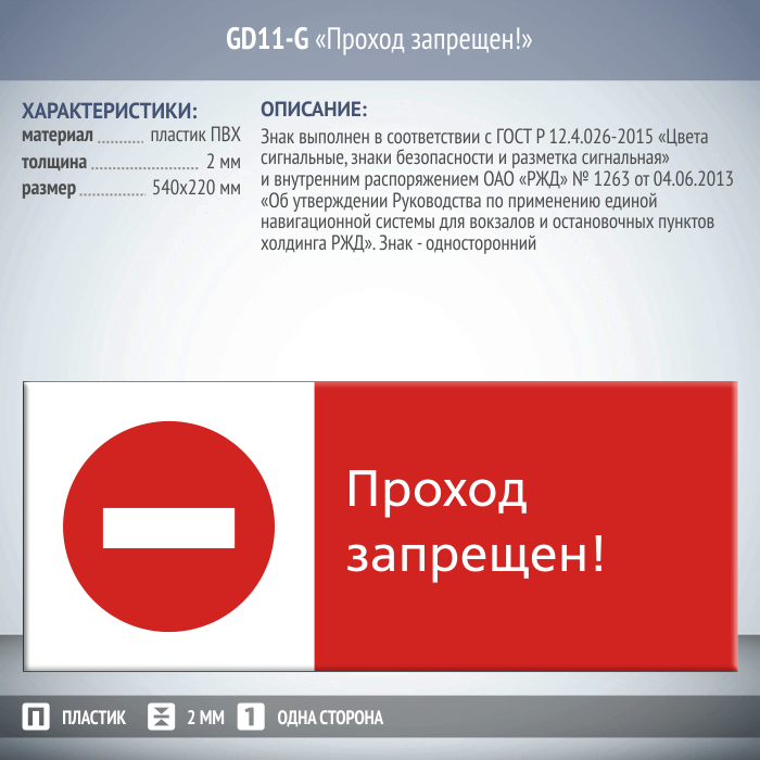 Знак «Проход запрещен!», GD11-G (односторонний горизонтальный, 540х220 мм, пластик 2 мм) в Ульяновске купить