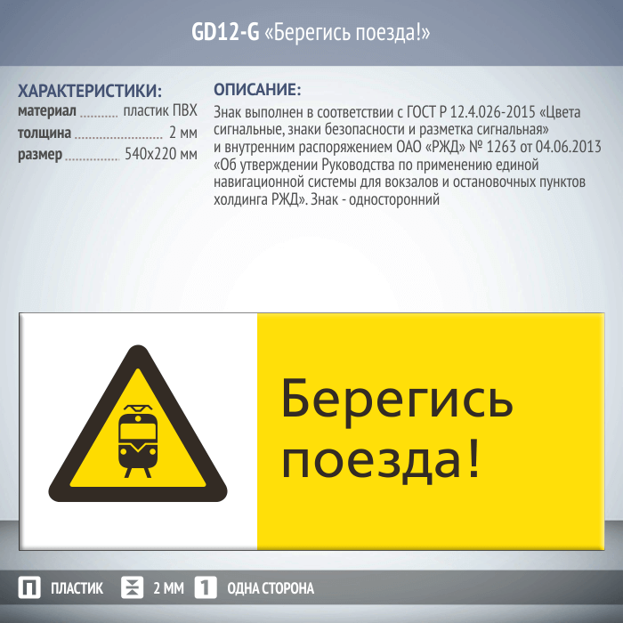 Знак «Берегись поезда!», GD12-G (односторонний горизонтальный, 540х220 мм, пластик 2 мм) в Ульяновске купить
