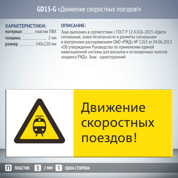 Знак «Движение скоростных поездов!», GD15-G (односторонний горизонтальный, 540х220 мм, пластик 2 мм) в Ульяновске купить