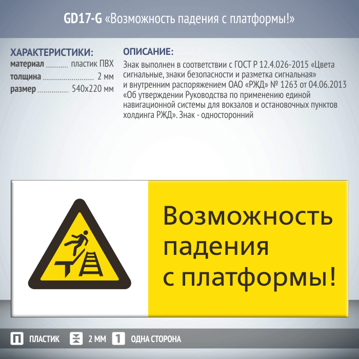 Знак «Возможность падения с платформы!», GD17-G (односторонний горизонтальный, 540х220 мм, пластик 2 мм) в Ульяновске купить