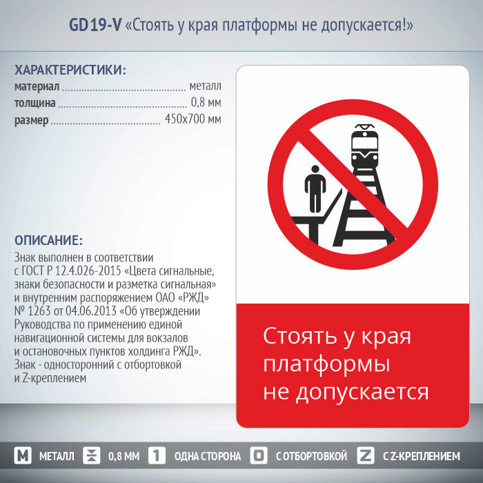 Знак «Стоять у края платформы не допускается!», GD19-V (односторонний вертикальный, 450х700 мм, металл, с отбортовкой и Z-креплением) в Ульяновске купить