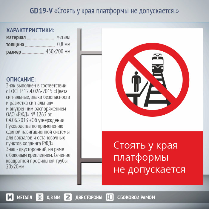 Знак «Стоять у края платформы не допускается!», GD19-V (двусторонний вертикальный, 450х700 мм, металл, на раме с боковым креплением) в Ульяновске купить
