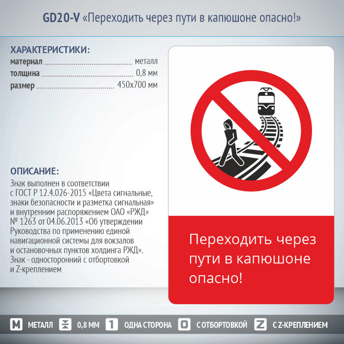 Знак «Переходить через пути в капюшоне опасно!», GD20-V (односторонний вертикальный, 450х700 мм, металл, с отбортовкой и Z-креплением) в Ульяновске купить
