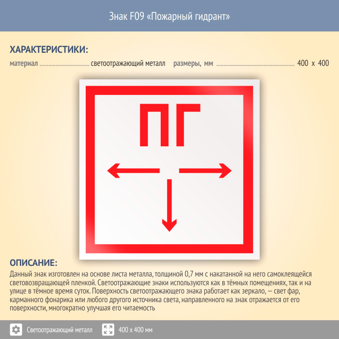 Знак F09 «Пожарный гидрант» (светоотражающий металл, 400х400 мм) в Ульяновске купить