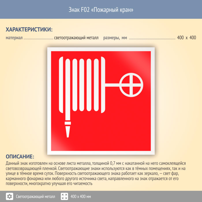 Знак F02 «Пожарный кран» (светоотражающий металл, 400х400 мм) в Ульяновске купить
