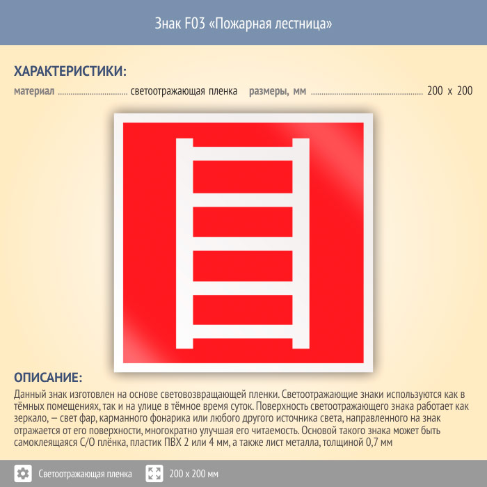 Знак F03 «Пожарная лестница» (светоотражающая пленка, 200х200 мм) в Ульяновске купить