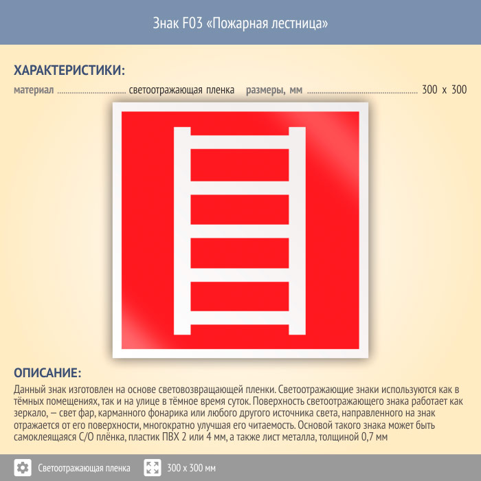 Знак F03 «Пожарная лестница» (светоотражающая пленка, 300х300 мм) в Ульяновске купить