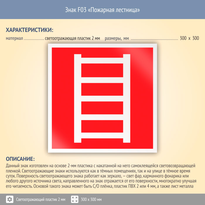 Знак F03 «Пожарная лестница» (светоотражающий пластик, 300х300 мм) в Ульяновске купить