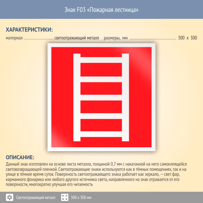 Знак F03 «Пожарная лестница» (светоотражающий металл, 300х300 мм) в Ульяновске купить