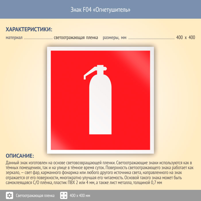 Знак F04 «Огнетушитель» (светоотражающая пленка, 400х400 мм) в Ульяновске купить