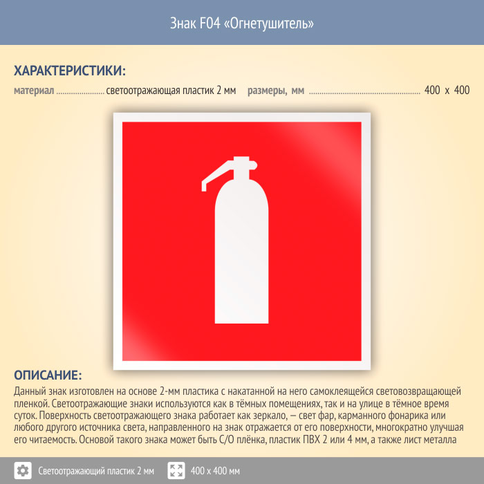 Знак F04 «Огнетушитель» (светоотражающий пластик, 400х400 мм) в Ульяновске купить
