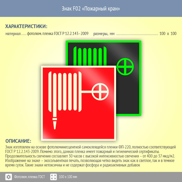 Знак F02 «Пожарный кран» (фотолюминесцентная пленка ГОСТ 34428-2018, 100х100 мм) в Ульяновске купить