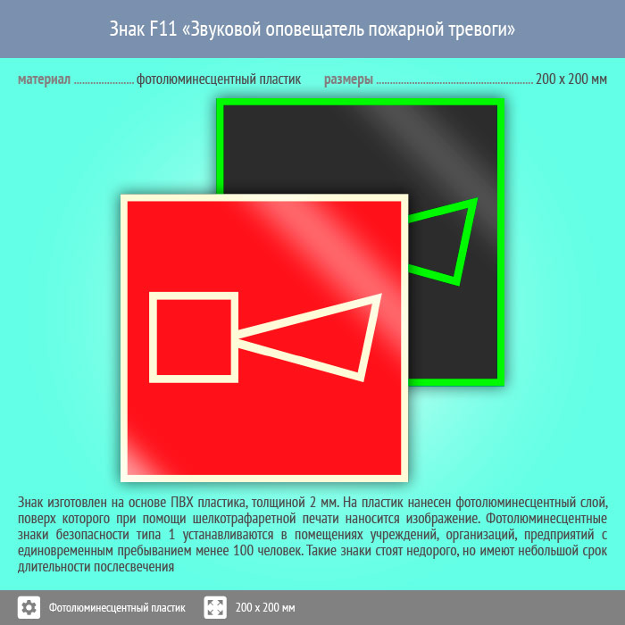 Знак F11 «Звуковой оповещатель пожарной тревоги» (фотолюминесцентный пластик, 200х200 мм) в Ульяновске купить