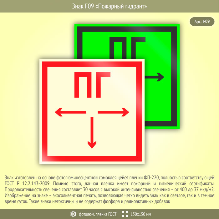 Знак F09 «Пожарный гидрант» (фотолюминесцентная пленка ГОСТ 34428-2018, 150х150 мм) в Ульяновске купить