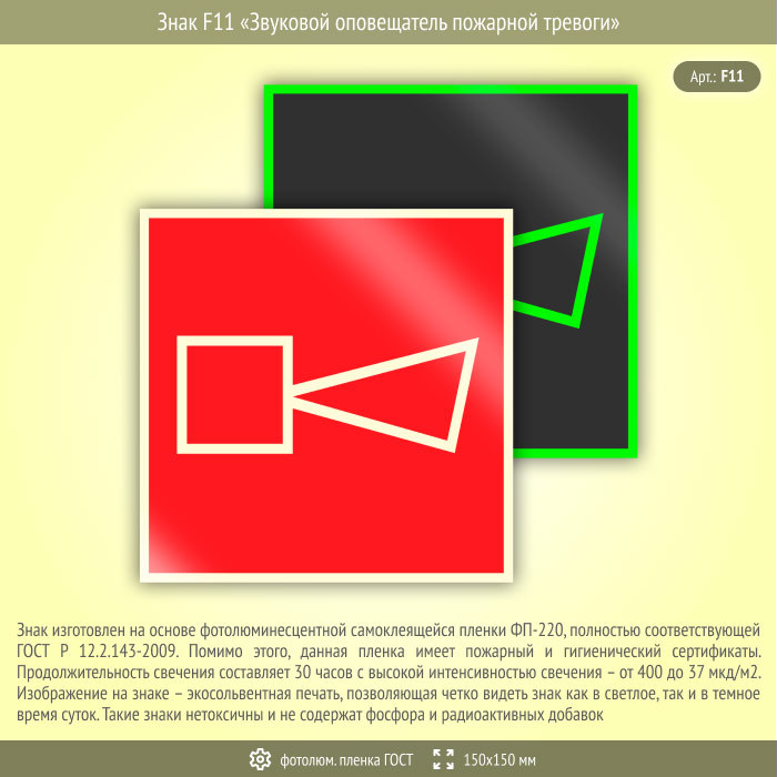 Знак F11 «Звуковой оповещатель пожарной тревоги» (фотолюминесцентная пленка ГОСТ 34428-2018, 150х150 мм) в Ульяновске купить