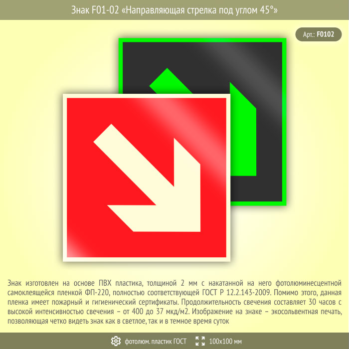 Знак F01-02 «Направляющая стрелка под углом 45°» (фотолюминесцентный пластик ГОСТ 34428-2018, 100х100 мм) в Ульяновске купить