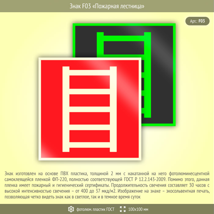 Знак F03 «Пожарная лестница» (фотолюминесцентный пластик ГОСТ 34428-2018, 100х100 мм) в Ульяновске купить