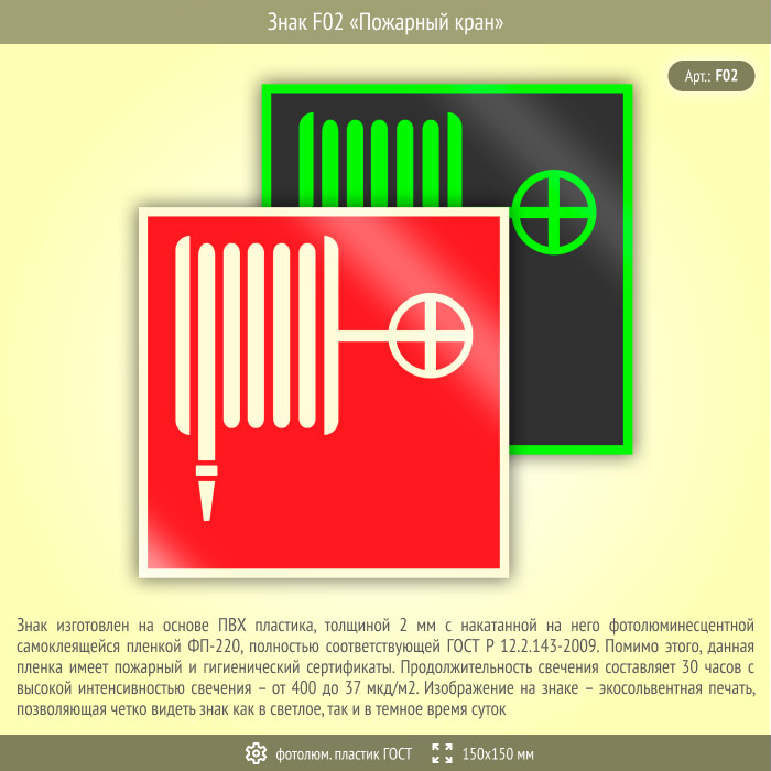 Знак F02 «Пожарный кран» (фотолюминесцентный пластик ГОСТ 34428-2018, 150х150 мм) в Ульяновске купить