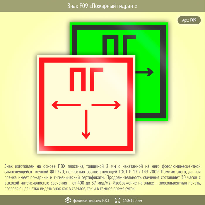 Знак F09 «Пожарный гидрант» (фотолюминесцентный пластик ГОСТ 34428-2018, 150х150 мм) в Ульяновске купить