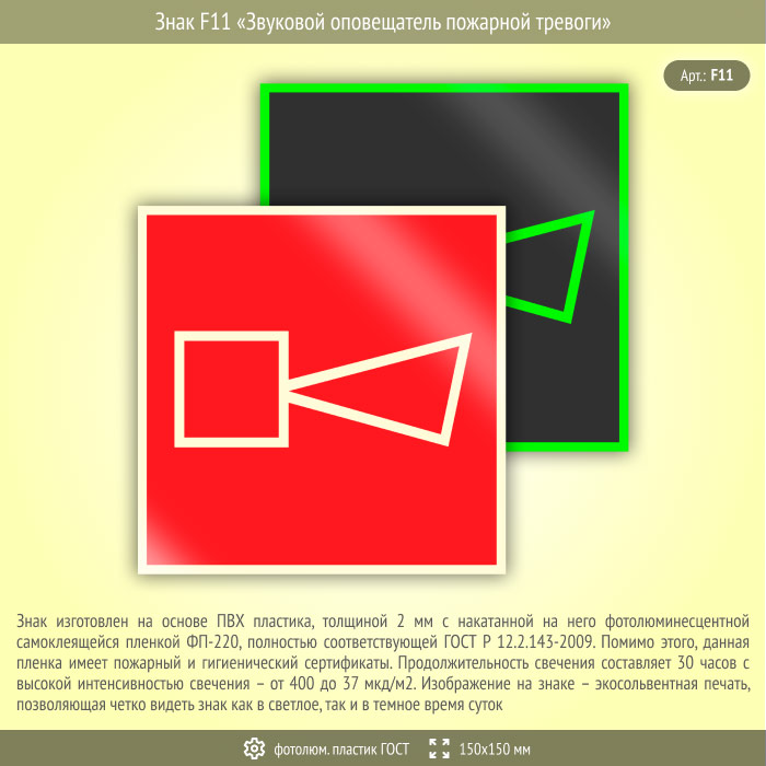Знак F11 «Звуковой оповещатель пожарной тревоги» (фотолюминесцентный пластик ГОСТ 34428-2018, 150х150 мм) в Ульяновске купить