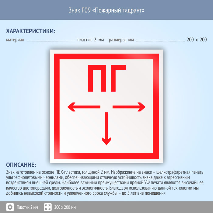 Знак F09 «Пожарный гидрант» (пластик, 200х200 мм) в Ульяновске купить