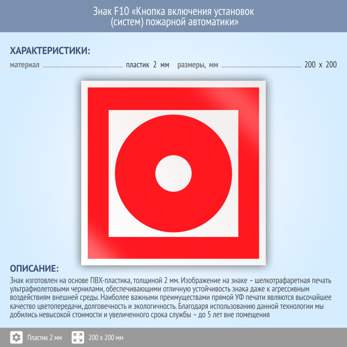 Знак F10 «Кнопка включения установок (систем) пожарной автоматики» (пластик, 200х200 мм) в Ульяновске купить