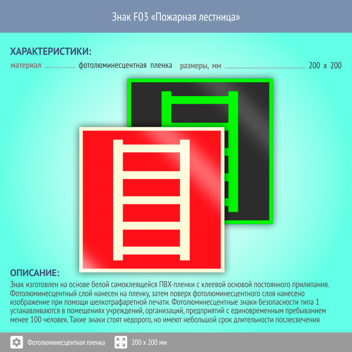 Знак F03 «Пожарная лестница» (фотолюминесцентная пленка, 200х200 мм) в Ульяновске купить