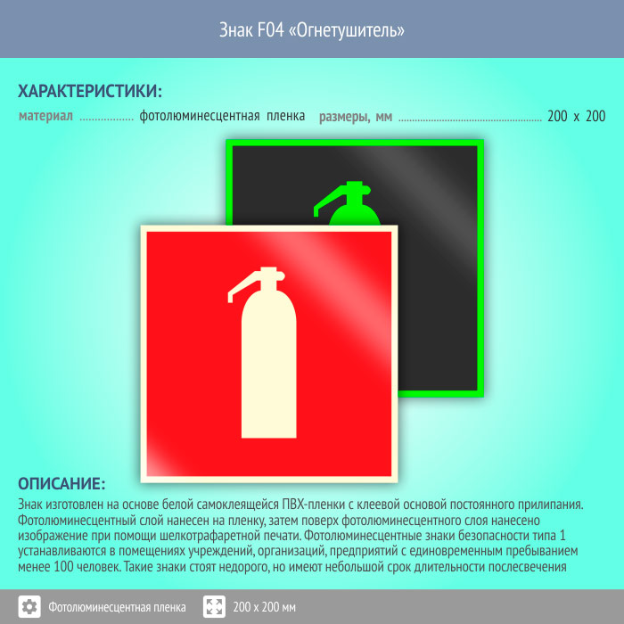 Знак F04 «Огнетушитель» (фотолюминесцентная пленка, 200х200 мм) в Ульяновске купить