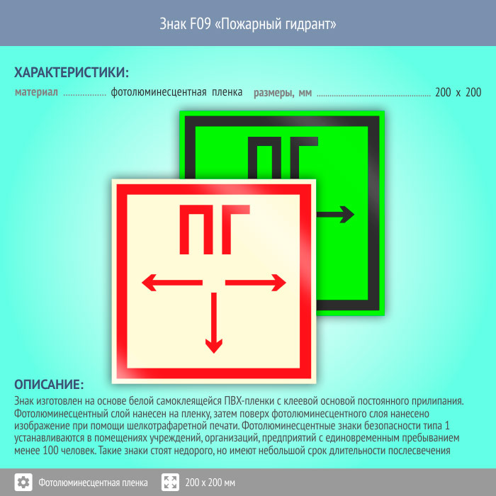 Знак F09 «Пожарный гидрант» (фотолюминесцентная пленка, 200х200 мм) в Ульяновске купить