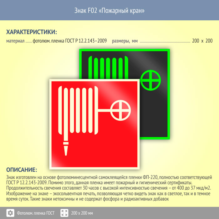 Знак F02 «Пожарный кран» (фотолюминесцентная пленка ГОСТ 34428-2018, 200х200 мм) в Ульяновске купить