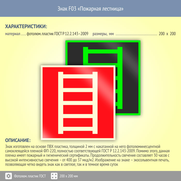 Знак F03 «Пожарная лестница» (фотолюминесцентный пластик ГОСТ 34428-2018, 200х200 мм) в Ульяновске купить
