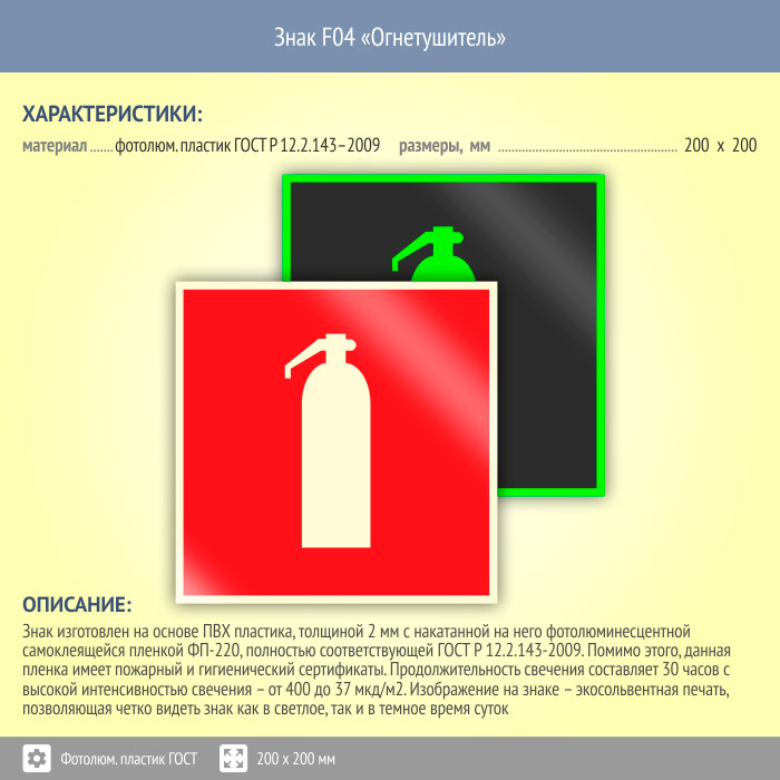 Знак F04 «Огнетушитель» (фотолюминесцентный пластик ГОСТ 34428-2018, 200х200 мм) в Ульяновске купить