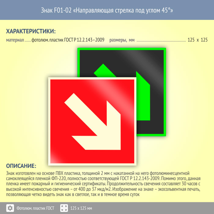 Знак F01-02 «Направляющая стрелка под углом 45°» (фотолюминесцентный пластик ГОСТ 34428-2018, 125х125 мм) в Ульяновске купить
