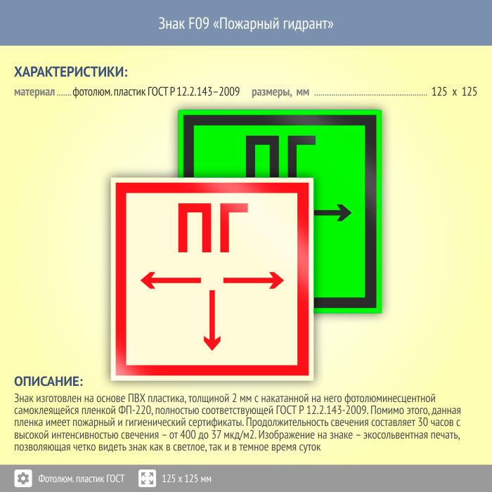 Знак F09 «Пожарный гидрант» (фотолюминесцентный пластик ГОСТ 34428-2018, 125х125 мм) в Ульяновске купить