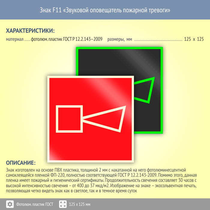 Знак F11 «Звуковой оповещатель пожарной тревоги» (фотолюминесцентный пластик ГОСТ 34428-2018, 125х125 мм) в Ульяновске купить